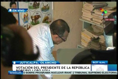 El presidente de Honduras, Porfirio Lobo, ejerció este domingo a las 08H30 locales (14H30 GMT) su derecho al voto en la escuela Rosa Luisa de Ochoa, de Juticalpa y llamó al pueblo "a votar por la paz y la democracia".