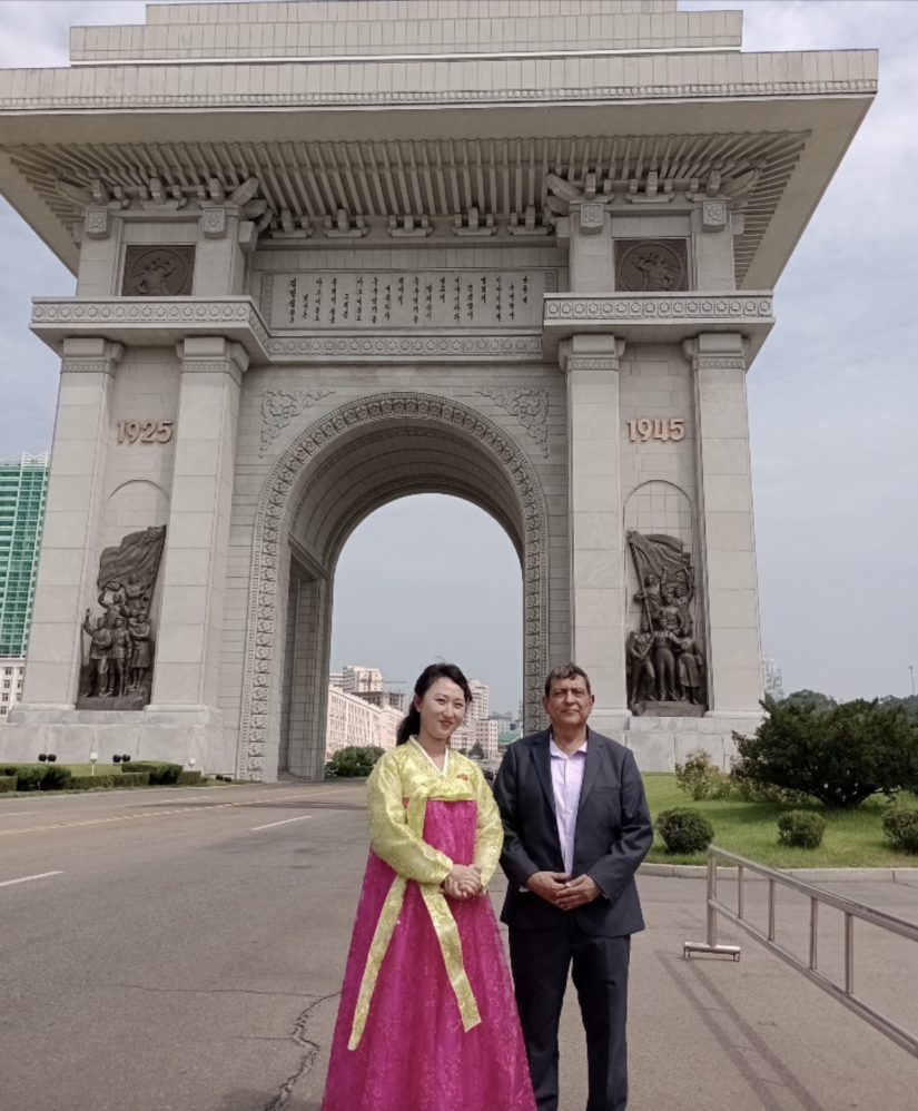 En el recorrido visitó el imponente monumento a la Idea Juche, que conmemora el pensamiento del Gran Líder Kim Il Sung, que es la guía del Pueblo Coreano y que plantea el Desarrollo de la Revolución y el País, por su propia fuerza y sus propios recursos.