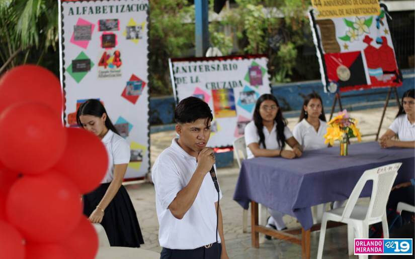 "El día de hoy para conmemorar el 44 aniversario de la Cruzada Nacional de Alfabetización tenemos una liga del conocimiento o liga del saber por parte de los estudiantes del Colegio Naciones Unidas y el Instituto Enrique Flores. Tenemos una pequeña cajita de un dado donde cada estudiante va a llegar a retirar una pregunta y la moderadora les va a preguntar y si ellos contestan con la respuesta correcta se les dan dos puntos y si la respuesta está incompleta la pueden hacer de manera grupal y eso tiene un valor de un punto", explicó el coordinador del Ministerio de Educación, Mined.