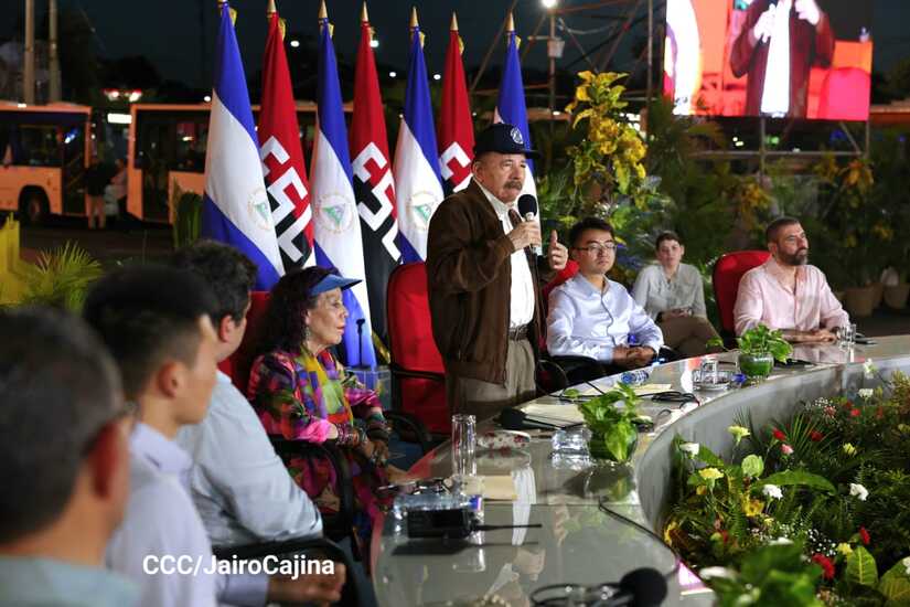 “Bueno, 100 autobuses que nos llegan desde miles y miles de kilómetros de distancia, pero la distancia no nos separa, la distancia más bien nos une, nos acerca, desde allá transportando estos buses que ahora el transporte será directo, porque se abrió una ruta marítima desde China, directamente a Nicaragua, a descargar en Corinto. Y ya vino el primer barco, el primer barco que vino con los equipos, implementos, etcétera, para la construcción del Aeropuerto de Panchito, tendremos un aeropuerto moderno, seguro”, dijo Daniel.