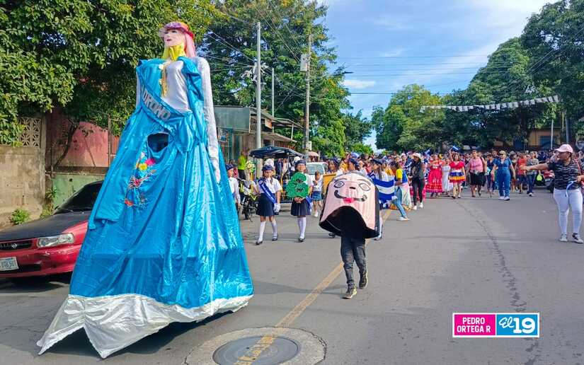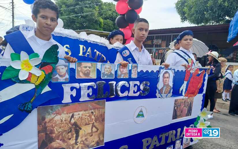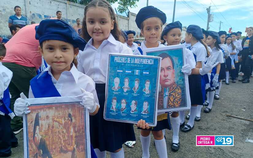 Banderas de Nicaragua, afiches con la imagen de los Próceres de la Independencia, Héroes de la Patria, como Andrés Castro, General José Dolores Estrada, Miguel Larreynaga, Rubén Darío, fueron parte de este desfile escolar en el que participaron el Colegio República de Cuba, Centro Escolar El Madroño, Colegio Bautista Camino de Vida, República de Panamá y Colegio Clementina Cabeza.