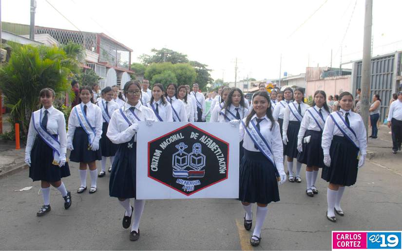 Los protagonistas fueron ordenados en bloques de estudiantes, encabezados por quienes portaron los emblemas nacionales, seguido de la Excelencia Académica, cultura y deporte a través de los Movimientos Juveniles Guardabarranco y Leonel Rugama, así como de la Cruzada Nacional de Alfabetización.