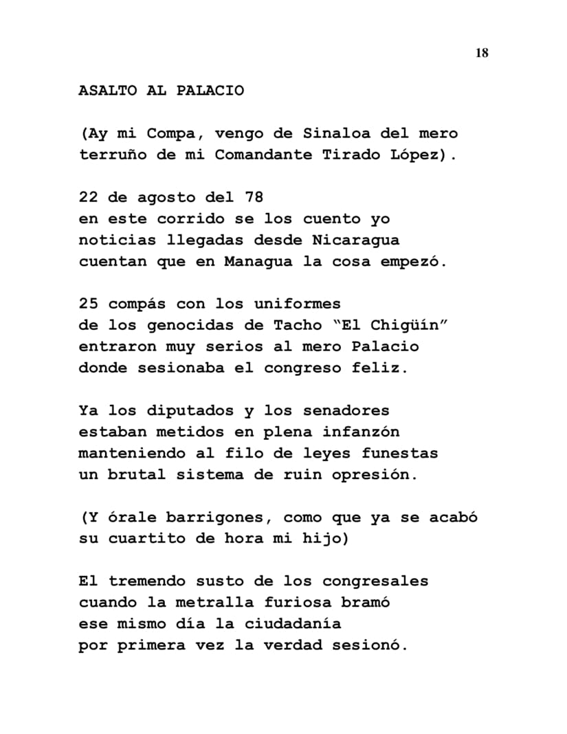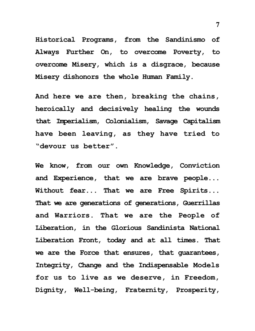 Aquí está Sandino... Aquí está Zeledón... Aquí están los Héroes de Pancasán... Aquí están los Héroes de Bocay... Aquí están los Héroes de la Insurrección Popular Sandinista, los Héroes del Triunfo de la Revolución, y del Triunfo sobre la Contrarrevolución; los Héroes del Triunfo sobre el Somocismo en todas sus formas... Aquí están los Héroes y Mártires, de todo tiempo... Y aquí estamos en la Era de los Pueblos... Somos Territorio Libre de Odio, de Maldad, de Traición. Somos Pueblos que caminamos, en la Luz, y entre Verdades Verdaderas !