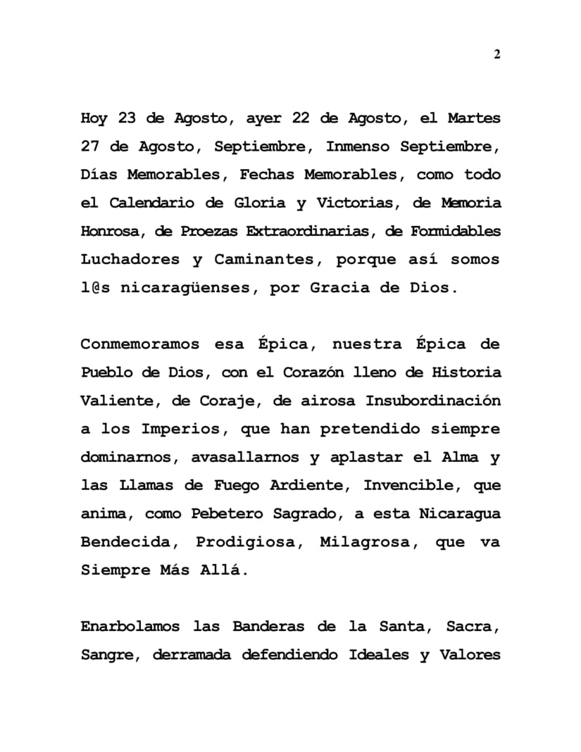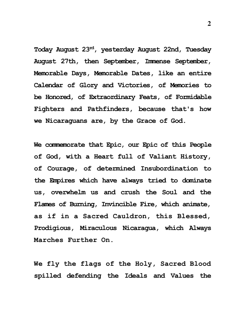Conmemoramos esa Épica, nuestra Épica de Pueblo de Dios, con el Corazón lleno de Historia Valiente, de Coraje, de airosa Insubordinación a los Imperios, que han pretendido siempre dominarnos, avasallarnos y aplastar el Alma y las Llamas de Fuego Ardiente, Invencible, que anima, como Pebetero Sagrado, a esta Nicaragua Bendecida, Prodigiosa, Milagrosa, que va Siempre Más Allá.