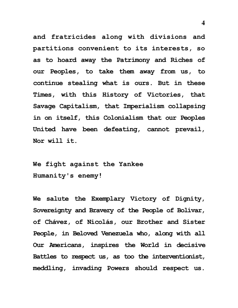 Ese Capitalismo Salvaje, desde el Imperialismo y el Colonialismo, ha desatado guerras, genocidios, fratricidios y divisiones y particiones convenientes a sus intereses, para acaparar las Riquezas Patrimoniales de nuestros Pueblos, para quitarnos lo nuestro, para seguirnos robando lo nuestro. Pero en estos Tiempos que son de Historia de Victorias, ese Capitalismo Salvaje, ese Imperialismo de capa caída, ese Colonialismo que los Pueblos Unidos hemos venido venciendo, No Puede, Ni Podrá.