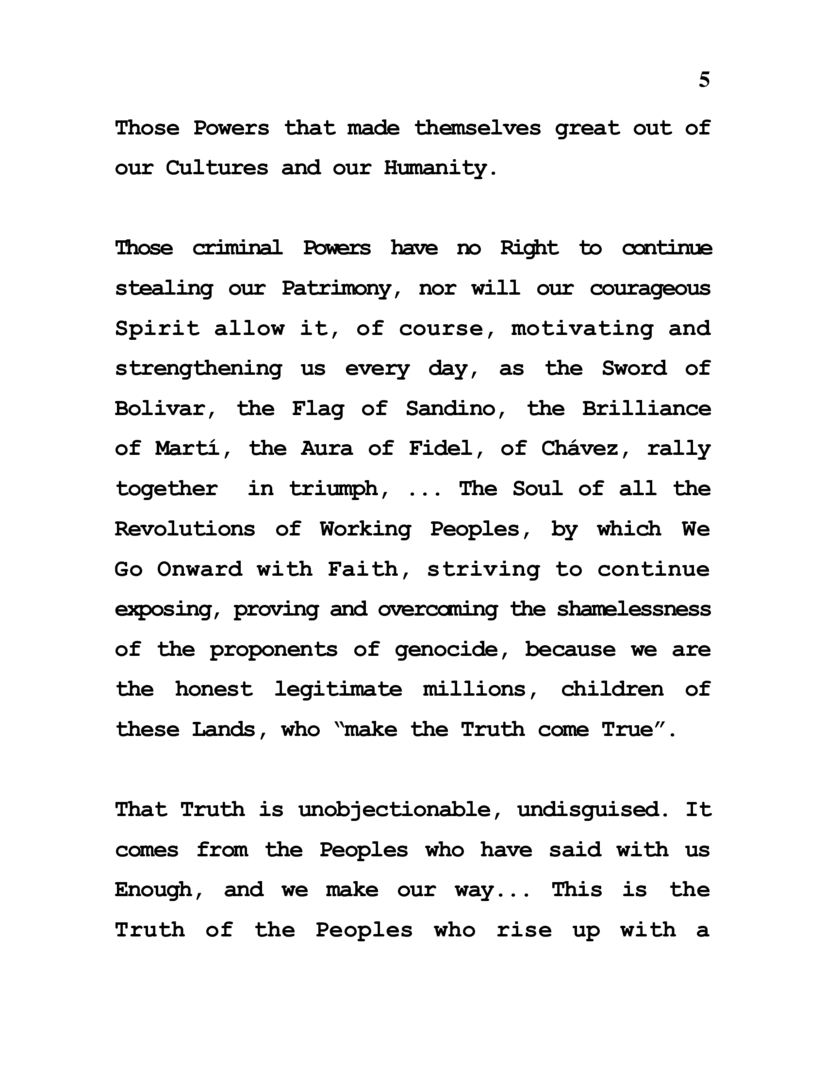Saludamos la Victoria Ejemplar de la Dignidad, la Soberanía, la Bravura del Pueblo de Bolívar, de Chávez, de Nicolás, Pueblo Hermano, en esa Venezuela Querida que, con nosotros los Nuestroamericanos, inspira al Mundo en Batallas decisivas para hacernos respetar, como deben respetarnos las Potencias injerencistas, interventoras, invasoras. Esas Potencias que se hicieron grandes sobre nuestras Culturas y Humanidades. Esas Potencias criminales que no tienen ningún Derecho a seguir despojándonos de nuestros Patrimonios, ni lo permitirá, por supuesto, el aguerrido Espíritu que nos anima y fortalece cada día, cuando se movilizan triunfales, la Espada de Bolívar, la Bandera de Sandino, el Fulgor de Martí, el Aura de Fidel, de Chávez... El Alma de todas las Revoluciones de Pueblos Trabajadores, que Vamos Adelante con Fé, luchando para seguir exponiendo, evidenciando y venciendo, la desvergüenza de los genocidas, porque somos millones honrados y legítimos, l@s hij@s de estas Tierras, que “imponemos la Verdad”.