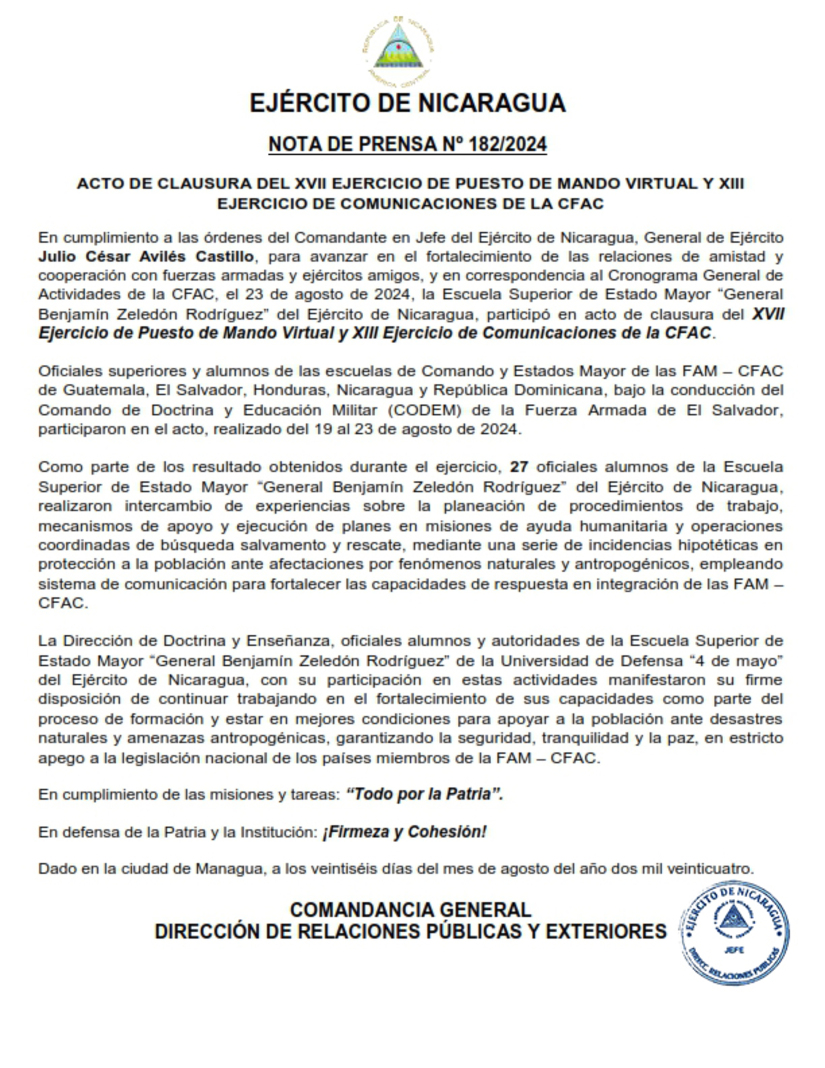 En cumplimiento a las órdenes del Comandante en Jefe del Ejército de Nicaragua, General de Ejército Julio César Avilés Castillo, para avanzar en el fortalecimiento de las relaciones de amistad y cooperación con fuerzas armadas y ejércitos amigos, y en correspondencia al Cronograma General de Actividades de la CFAC, el 23 de agosto de 2024, la Escuela Superior de Estado Mayor “General Benjamín Zeledón Rodríguez” del Ejército de Nicaragua, participó en acto de clausura del XVII Ejercicio de Puesto de Mando Virtual y XIII Ejercicio de Comunicaciones de la CFAC.
