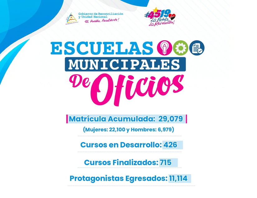 Hoy miércoles 28 de Agosto, en horas de la tarde, será inaugurada en el Municipio de Nueva Guinea la Escuela de Oficios “Yelba María Antúnez”, ubicada en la Zona 1 de este Municipio, en coordinación con INATEC se brindarán los siguientes cursos; Costura Creativa, Elaboración de Arreglos Florales, Tratamiento Estético de Manos y Pies, entre otros. Atenderán una matrícula inicial de más de 130 protagonistas.