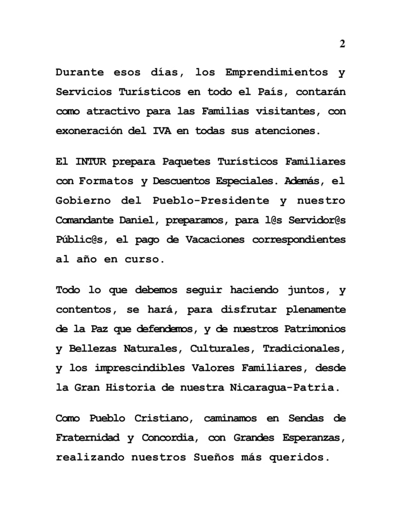 INTUR has prepared Family tour packages with Special Formats and Discounts. In addition, the Government of the People as President and our Comandante Daniel are preparing, for Pub-lic Servants, their vacation payments corre-sponding to the current year.