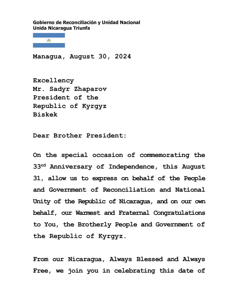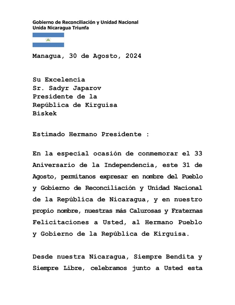 En la especial ocasión de conmemorar el 33 Aniversario de la Independencia, este 31 de Agosto, permítanos expresar en nombre del Pueblo y Gobierno de Reconciliación y Unidad Nacional de la República de Nicaragua, y en nuestro propio nombre, nuestras más Calurosas y Fraternas Felicitaciones a Usted, al Hermano Pueblo y Gobierno de la República de Kirguisa.