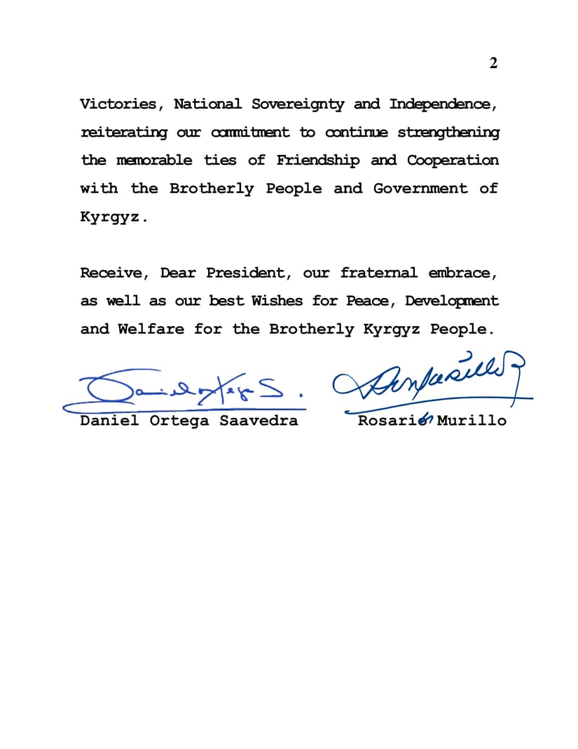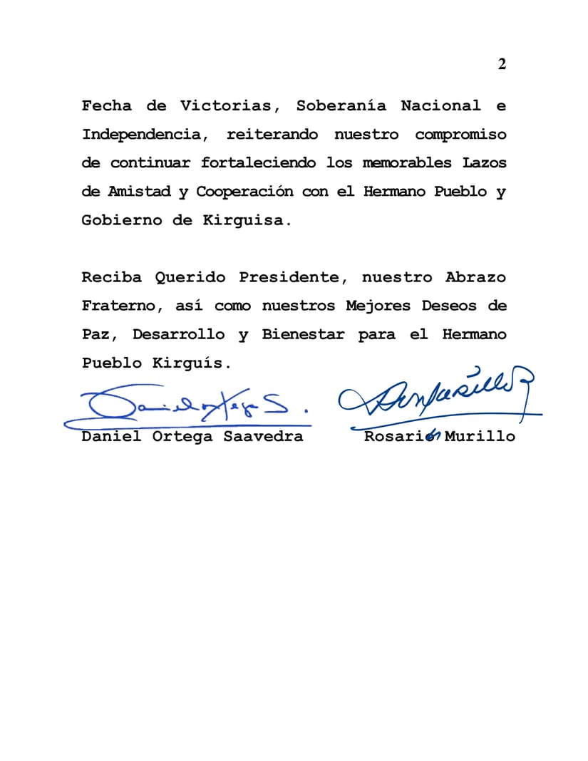 Desde nuestra Nicaragua, Siempre Bendita y Siempre Libre, celebramos junto a Usted esta Fecha de Victorias, Soberanía Nacional e Independencia, reiterando nuestro compromiso de continuar fortaleciendo los memorables Lazos de Amistad y Cooperación con el Hermano Pueblo y Gobierno de Kirguisa.