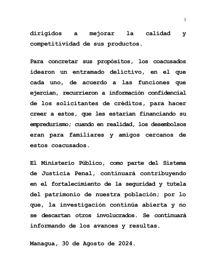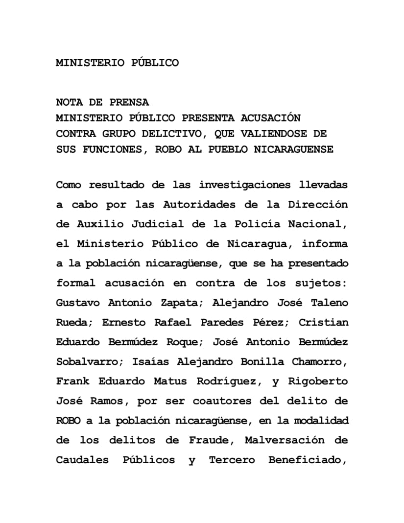 Como resultado de las investigaciones llevadas a cabo por las Autoridades de la Dirección de Auxilio Judicial de la Policía Nacional, el Ministerio Público de Nicaragua, informa a la población nicaragüense, que se ha presentado formal acusación en contra de los sujetos: Gustavo Antonio Zapata; Alejandro José Taleno Rueda; Ernesto Rafael Paredes Pérez; Cristian Eduardo Bermúdez Roque; José Antonio Bermúdez Sobalvarro; Isaías Alejandro Bonilla Chamorro, Frank Eduardo Matus Rodríguez, y Rigoberto José Ramos, por ser coautores del delito de ROBO a la población nicaragüense, en la modalidad de los delitos de Fraude, Malversación de Caudales Públicos y Tercero Beneficiado, previstos y sancionados en los artículos 452, 454 y 459 del Código Penal.