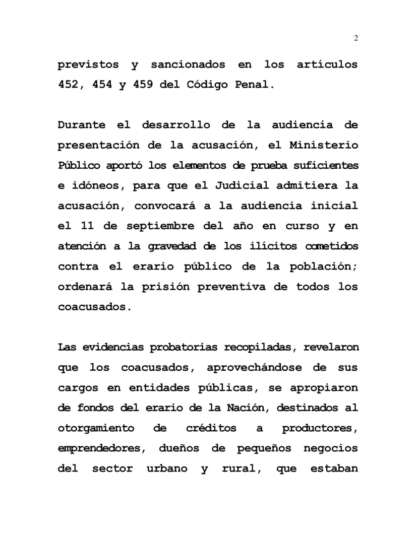 Las evidencias probatorias recopiladas, revelaron que los coacusados, aprovechándose de sus cargos en entidades públicas, se apropiaron de fondos del erario de la Nación, destinados al otorgamiento de créditos a productores, emprendedores, dueños de pequeños negocios del sector urbano y rural, que estaban dirigidos a mejorar la calidad y competitividad de sus productos.