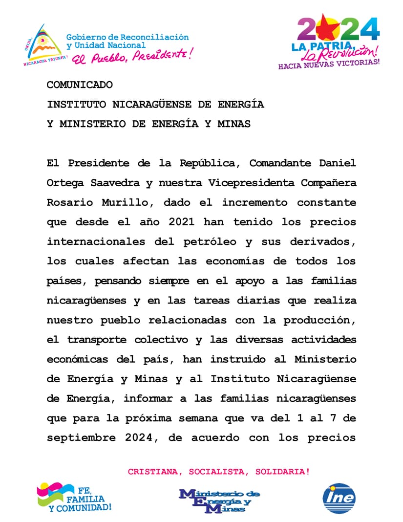 El Presidente de la República, Comandante Daniel Ortega Saavedra y nuestra Vicepresidenta Compañera Rosario Murillo, dado el incremento constante que desde el año 2021 han tenido los precios internacionales del petróleo y sus derivados, los cuales afectan las economías de todos los países, pensando siempre en el apoyo a las familias nicaragüenses y en las tareas diarias que realiza nuestro pueblo relacionadas con la producción, el transporte colectivo y las diversas actividades económicas del país, han instruido al Ministerio de Energía y Minas y al Instituto Nicaragüense de Energía, informar a las familias nicaragüenses que para la próxima semana que va del 1 al 7 de septiembre 2024, de acuerdo con los precios internacionales de los derivados del petróleo, los ajustes que se requieran no serán aplicados, manteniéndose los precios locales de los combustibles gasolinas y diésel sin variación, para beneficio de las familias nicaragüenses.