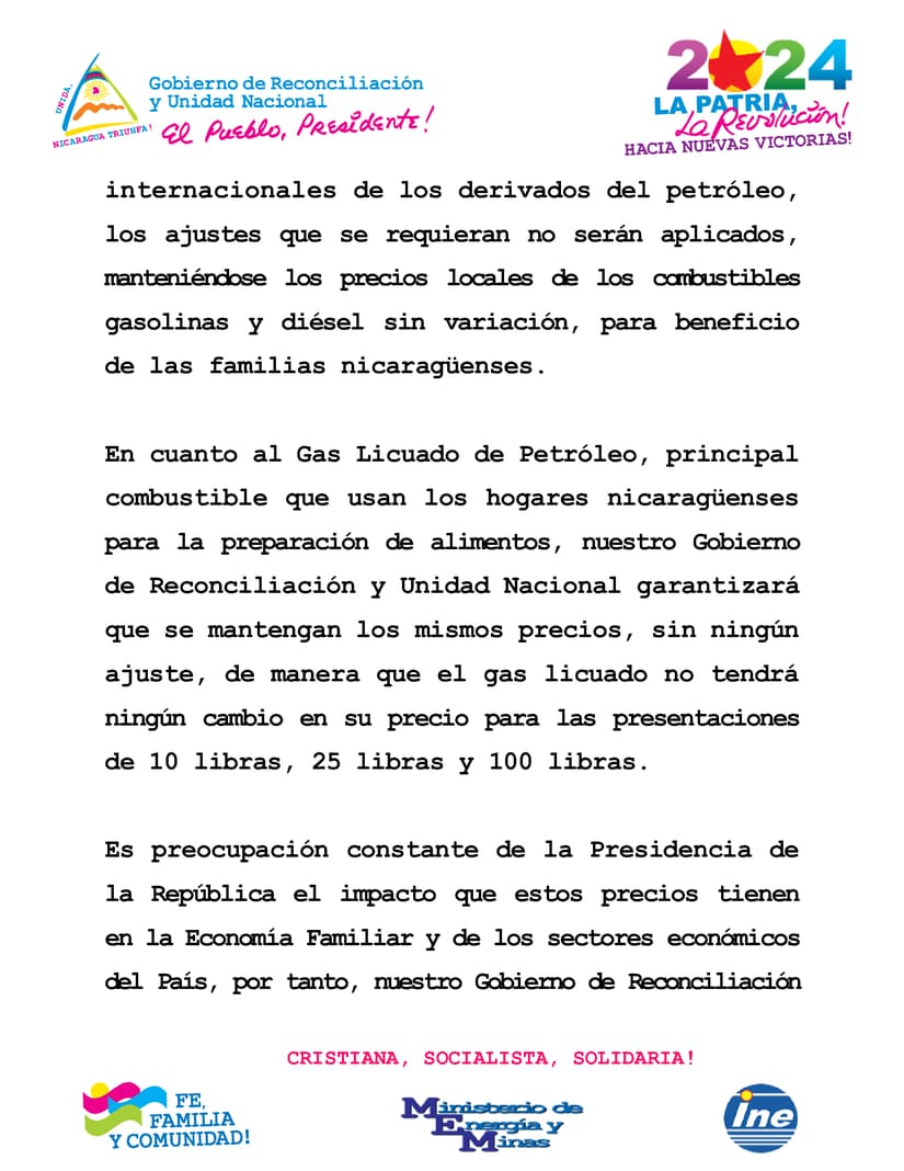 En cuanto al Gas Licuado de Petróleo, principal combustible que usan los hogares nicaragüenses para la preparación de alimentos, nuestro Gobierno de Reconciliación y Unidad Nacional garantizará que se mantengan los mismos precios, sin ningún ajuste, de manera que el gas licuado no tendrá ningún cambio en su precio para las presentaciones de 10 libras, 25 libras y 100 libras.