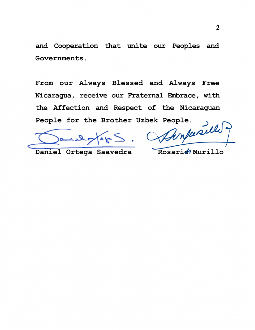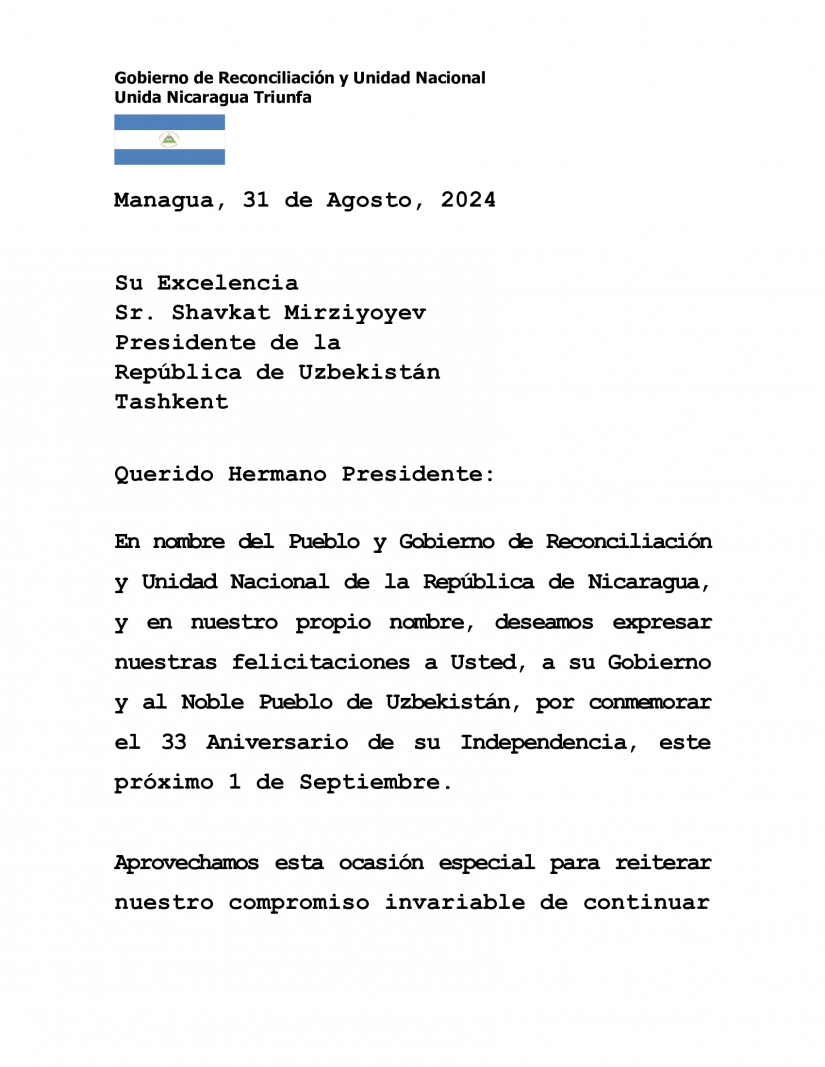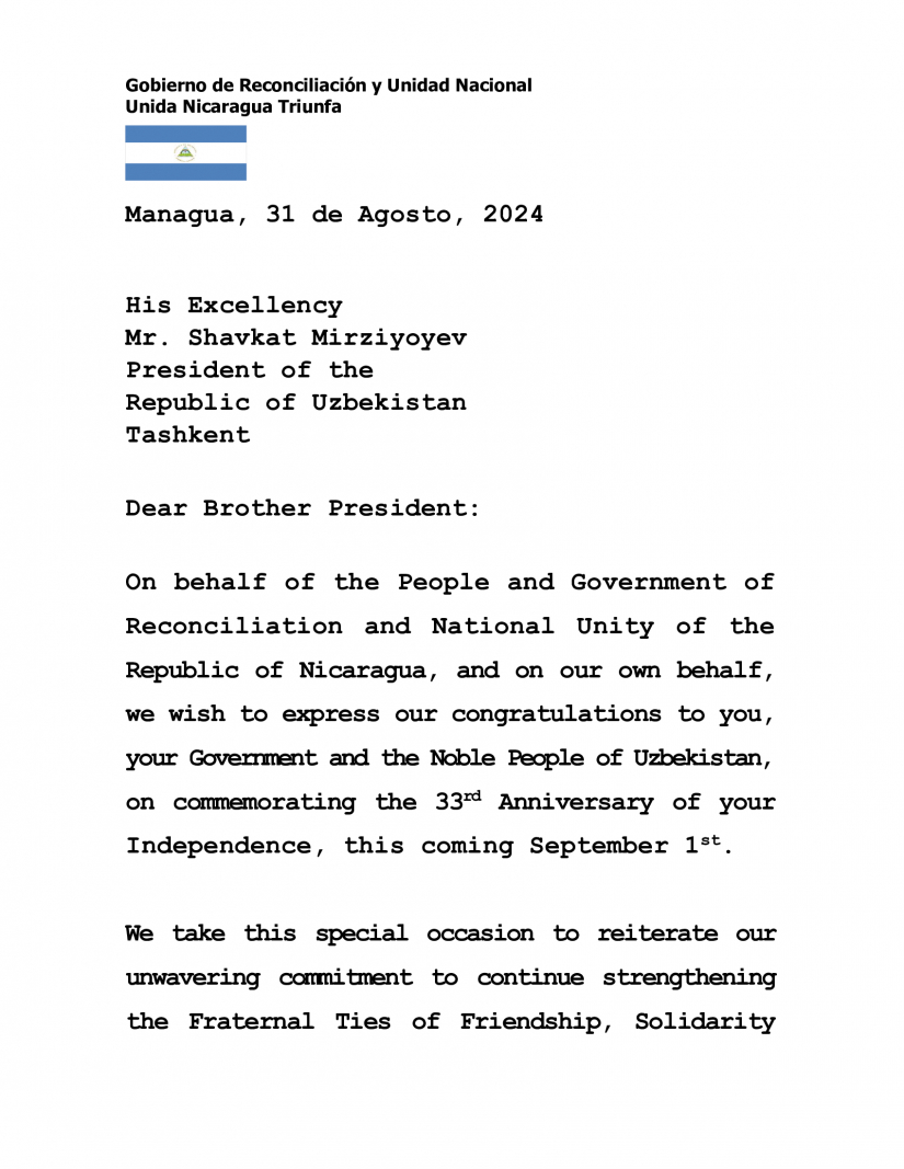 En nombre del Pueblo y Gobierno de Reconciliación y Unidad Nacional de la República de Nicaragua, y en nuestro propio nombre, deseamos expresar nuestras felicitaciones a Usted, a su Gobierno y al Noble Pueblo de Uzbekistán, por conmemorar el 33 Aniversario de su Independencia, este próximo 1 de Septiembre.