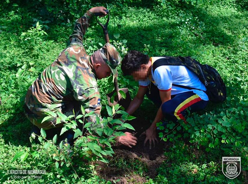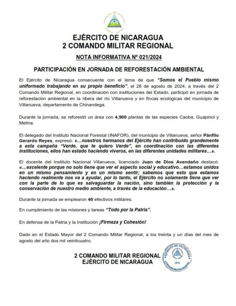 El Ejército de Nicaragua consecuente con el lema de que "Somos el Pueblo mismo uniformado trabajando en su propio beneficio", el 28 de agosto de 2024, a través del 2 Comando Militar Regional, en coordinación con instituciones del Estado, participó en jornada de reforestación ambiental en la ribera del rio Villanueva y en fincas ecológicas del municipio de Villanueva, departamento de Chinandega.