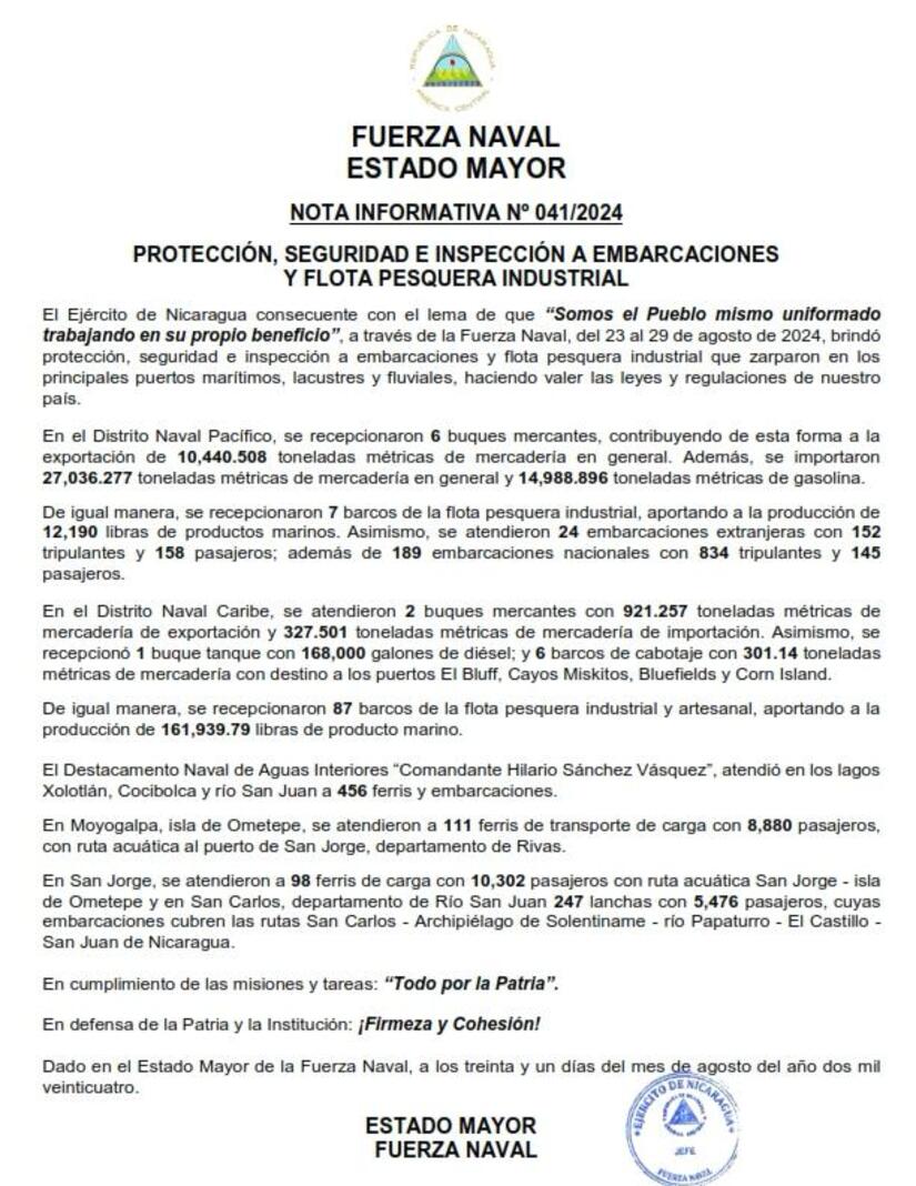 El Ejército de Nicaragua consecuente con el lema de que "Somos el Pueblo mismo uniformado trabajando en su propio beneficio", a través de la Fuerza Naval, del 23 al 29 de agosto de 2024, brindó protección, seguridad e inspección a embarcaciones y flota pesquera industrial que zarparon en los principales puertos marítimos, lacustres y fluviales, haciendo valer las leyes y regulaciones de nuestro pais.