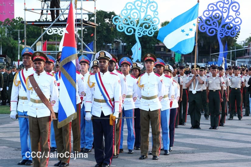 “Este día queremos agradecer a las Fuerzas Armadas de países amigos que nos han apoyado sin condiciones de ninguna naturaleza, nuestro agradecimiento a las Fuerzas Armadas de la Federación de Rusia, de Cuba, México, Venezuela, la República Popular China, a todos por su apoyo y cooperación y por supuesto nuestro agradecimiento a nuestros hermanos de los Ejércitos de Guatemala, El Salvador, Honduras y República Dominicana, por la fortalecida relaciones de amistad y cooperación que mantenemos pensando siempre en el bienestar de nuestros pueblos y destacamos la coordinación y cooperación con las Fuerzas Armadas de Honduras con la que hemos desarrollado 21 operaciones Sandino-Morazán de manera exitosa en nuestras fronteras comunes, igualmente destacamos las excelentes las relaciones de amistad y cooperación en el marco de los objetivos comunes de la Conferencia de Fuerzas Armadas Centroamericanas y de la Conferencia de Ejércitos Americanos, queremos en esta ceremonia agradecer la presencia de delegaciones, pelotones y abanderados que hoy nos acompañan y felicitar a los jefes de delegaciones que recibieron las condecoración 45 aniversario del Ejército de Nicaragua, de manos del Presidente de la República”.