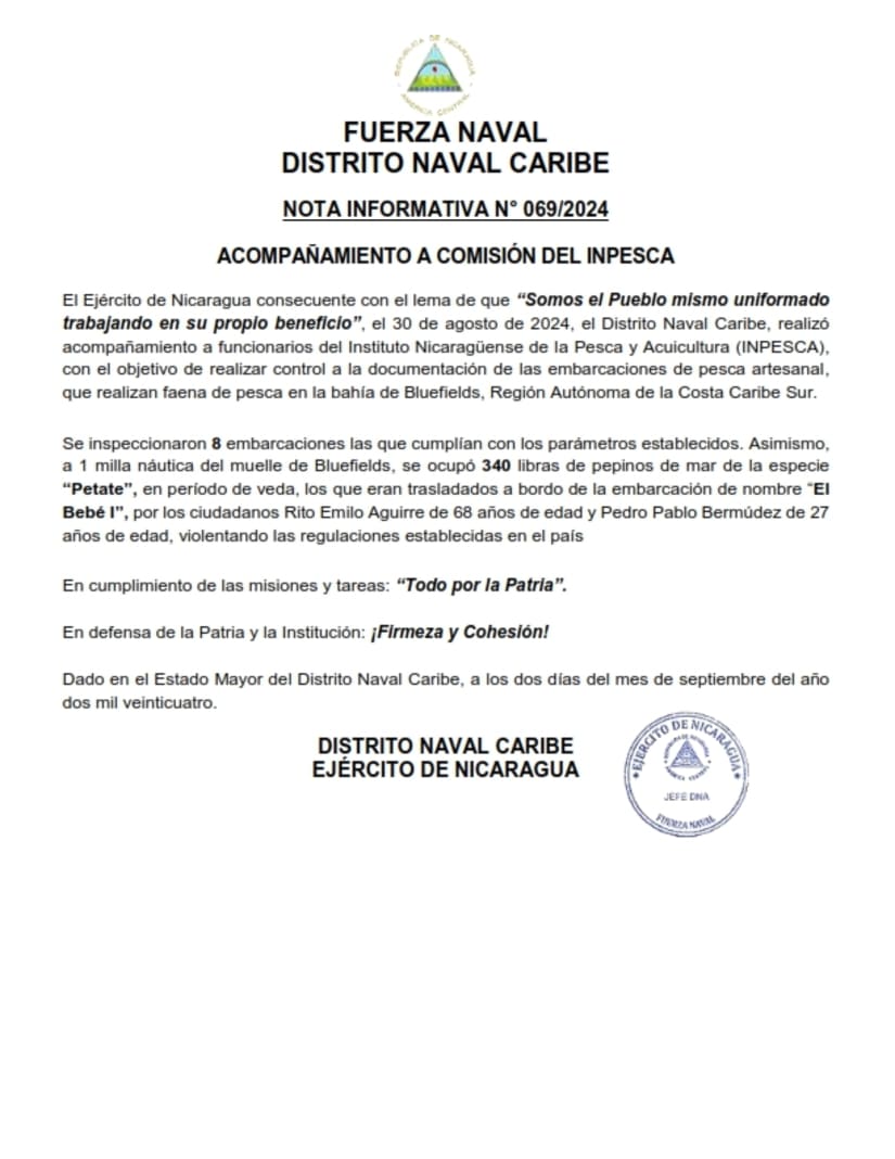 Se inspeccionaron 8 embarcaciones las que cumplían con los parámetros establecidos. Asimismo, a 1 milla náutica del muelle de Bluefields, se ocupó 340 libras de pepinos de mar de la especie “Petate”, en período de veda, los que eran trasladados a bordo de la embarcación de nombre “El Bebé I”, por los ciudadanos Rito Emilo Aguirre de 68 años de edad y Pedro Pablo Bermúdez de 27 años de edad, violentando las regulaciones establecidas en el país.