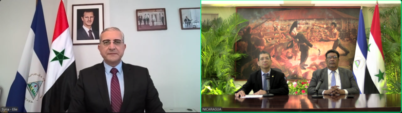 Este 4 Septiembre de 2024, en una Ceremonia Virtual desde nuestra Cancillería, los Compañeros Iván Lara y Valdrack Jaentschke, Ministros Asesores del Presidente de la República para Políticas y Asuntos Internacionales, recibieron las Copias de Estilo del Hermano Koussay Aldahhak, que lo acreditan oficialmente como Embajador de la República Árabe Siria ante el Pueblo y Gobierno de Nicaragua, concurrente desde ONU-Nueva York.