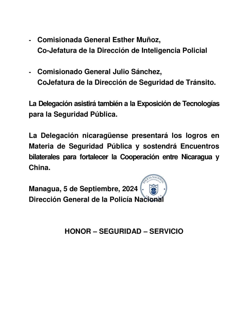 La Delegación nicaragüense presentará los logros en Materia de Seguridad Pública y sostendrá Encuentros bilaterales para fortalecer la Cooperación entre Nicaragua y China.