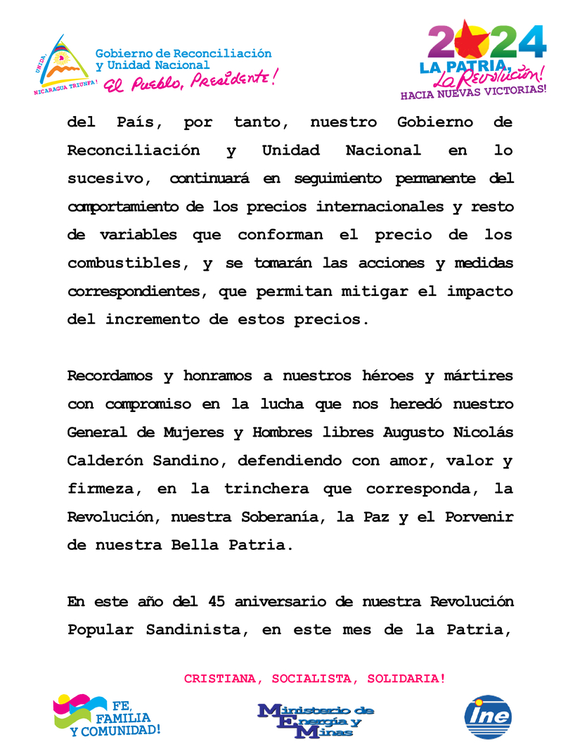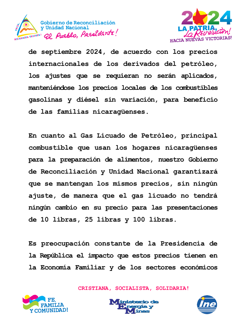 El Presidente de la República, Comandante Daniel Ortega Saavedra y nuestra Vicepresidenta Compañera Rosario Murillo, dado el incremento constante que desde el año 2021 han tenido los precios internacionales del petróleo y sus derivados, los cuales afectan las economías de todos los países, pensando siempre en el apoyo a las familias nicaragüenses y en las tareas diarias que realiza nuestro pueblo relacionadas con la producción, el transporte colectivo y las diversas actividades económicas del país, han instruido al Ministerio de Energía y Minas y al Instituto Nicaragüense de Energía, informar a las familias nicaragüenses que para la próxima semana que va del 8 al 14 de septiembre 2024, de acuerdo con los precios internacionales de los derivados del petróleo, los ajustes que se requieran no serán aplicados, manteniéndose los precios locales de los combustibles gasolinas y diésel sin variación, para beneficio de las familias nicaragüenses.