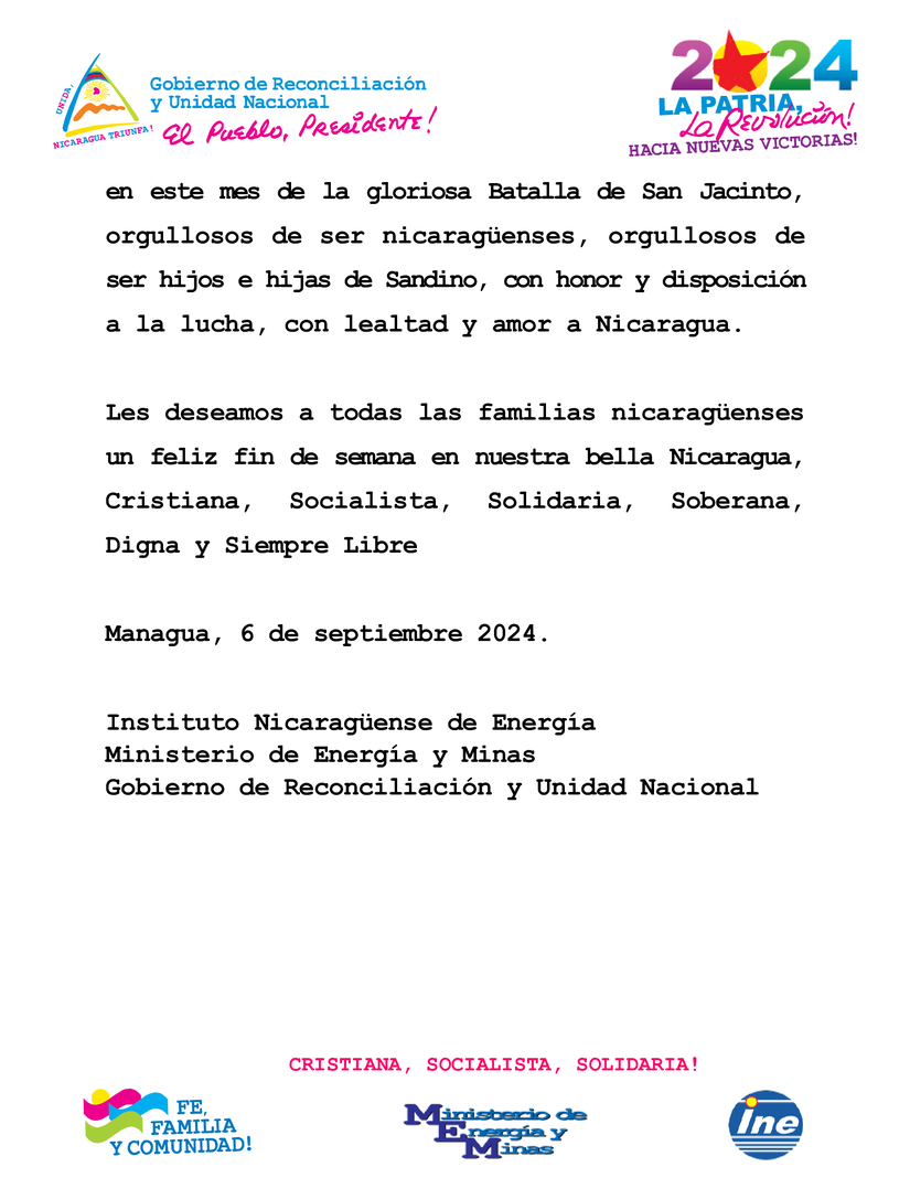Les deseamos a todas las familias nicaragüenses un feliz fin de semana en nuestra bella Nicaragua, Cristiana, Socialista, Solidaria, Soberana, Digna y Siempre Libre