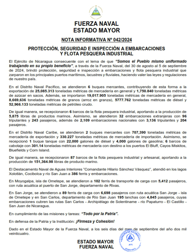 El Ejército de Nicaragua consecuente con el lema de que “Somos el Pueblo mismo uniformado trabajando en su propio beneficio”, a través de la Fuerza Naval, del 30 de agosto al 5 de septiembre de 2024, brindó protección, seguridad e inspección a embarcaciones y flota pesquera industrial que zarparon en los principales puertos marítimos, lacustres y fluviales, haciendo valer las leyes y regulaciones de nuestro país.