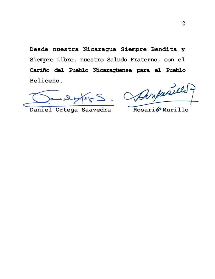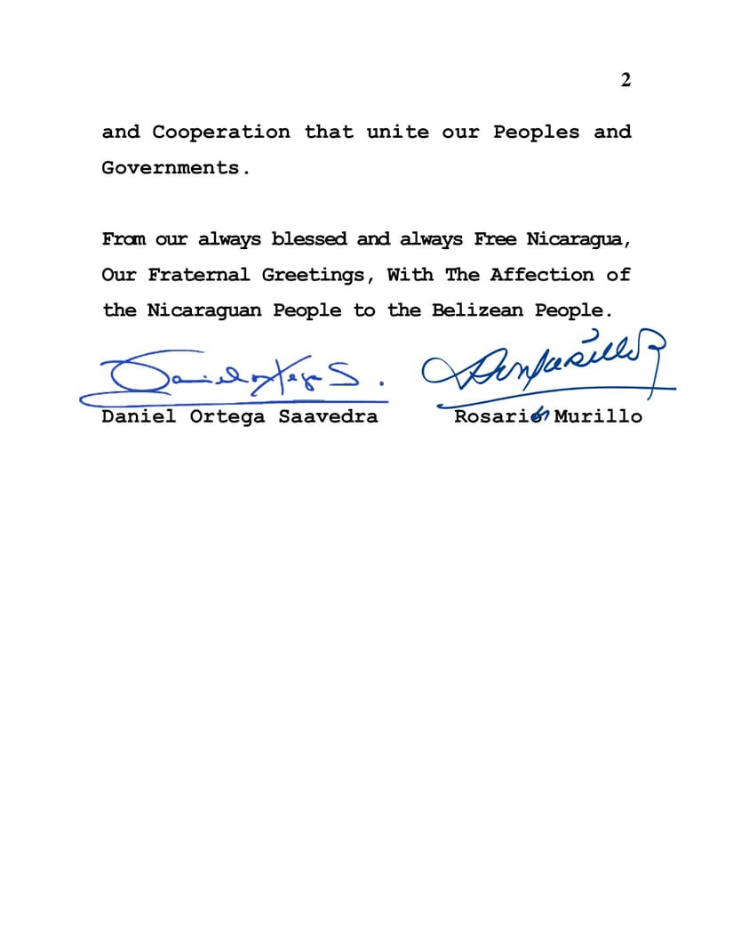 From our always blessed and always Free Nicaragua, Our Fraternal Greetings, With The Affection of the Nicaraguan People to the Belizean People.