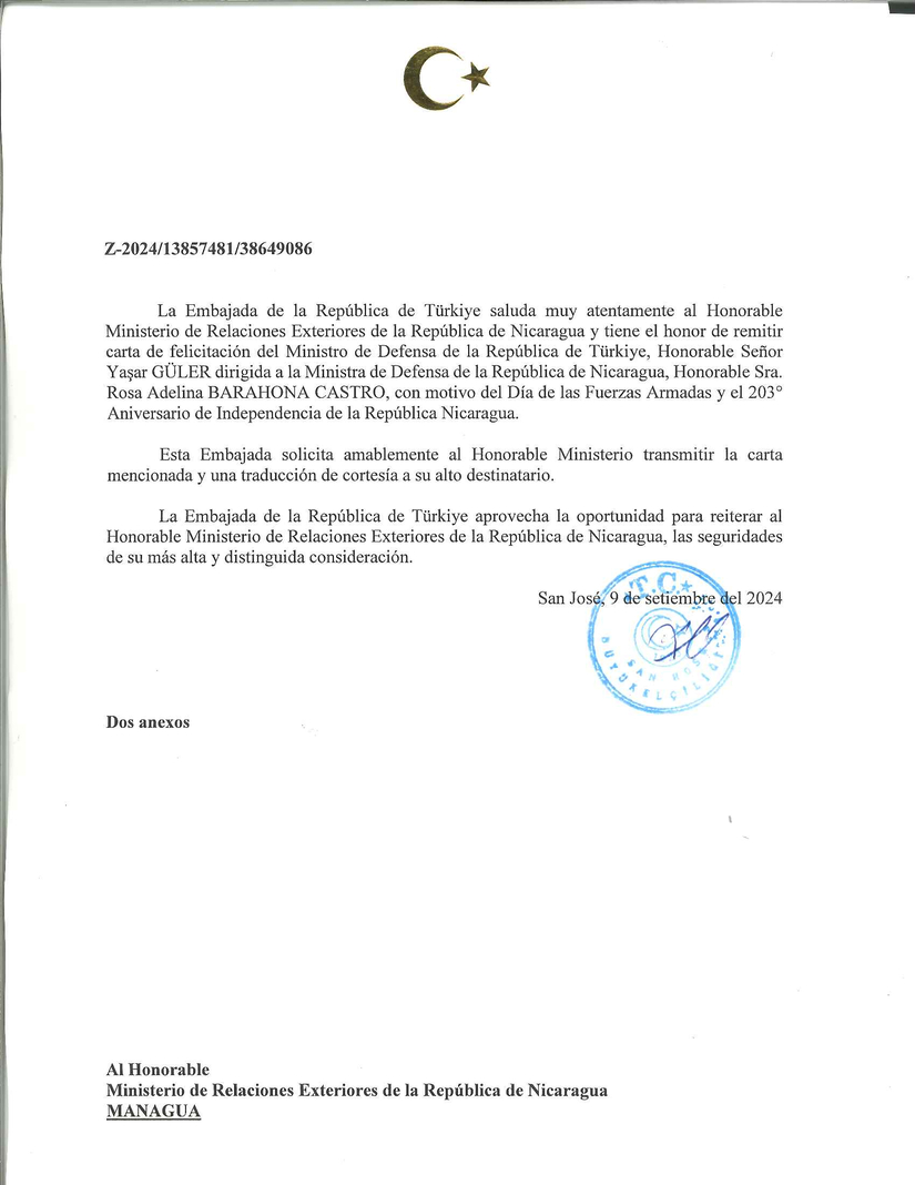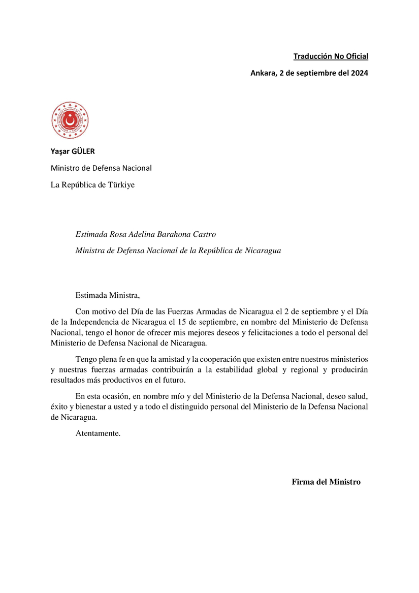 Carta de Felicitación del Ministro de Defensa de Türkiye, Sr. Yasar GÜLER, dirigida a la Compañera Rosa Adelina Barahona, MIDEF, con motivo del Aniversario de la Fundación del Ejército de Nicaragua y el 203 Aniversario de la Independencia de Nicaragua.
