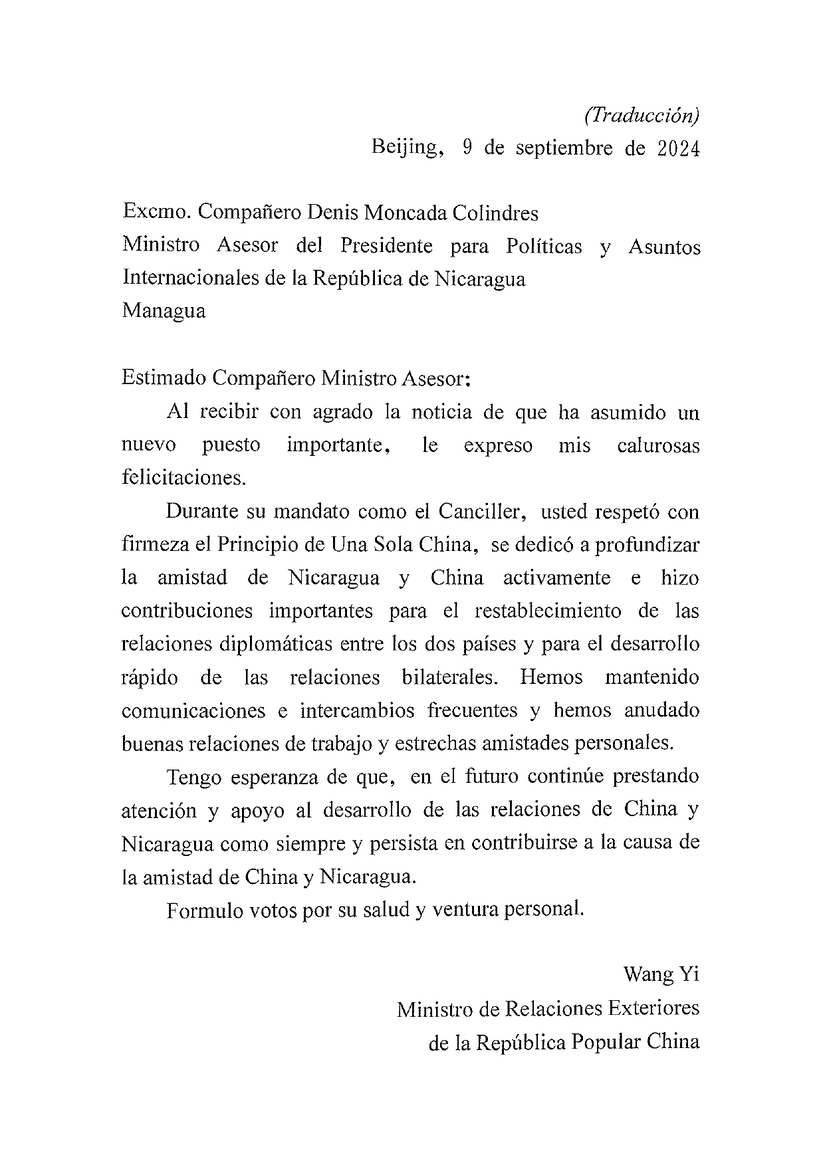Agradecemos sus Buenos Deseos y damos a conocer el texto de su Mensaje con Fraternal Reconocimiento. Igualmente, agradecemos la Carta de Saludo que el Compañero Wang Yi, Ministro de Relaciones Exteriores de la República Popular China, nos ha remitido para el Compañero Denis Moncada.