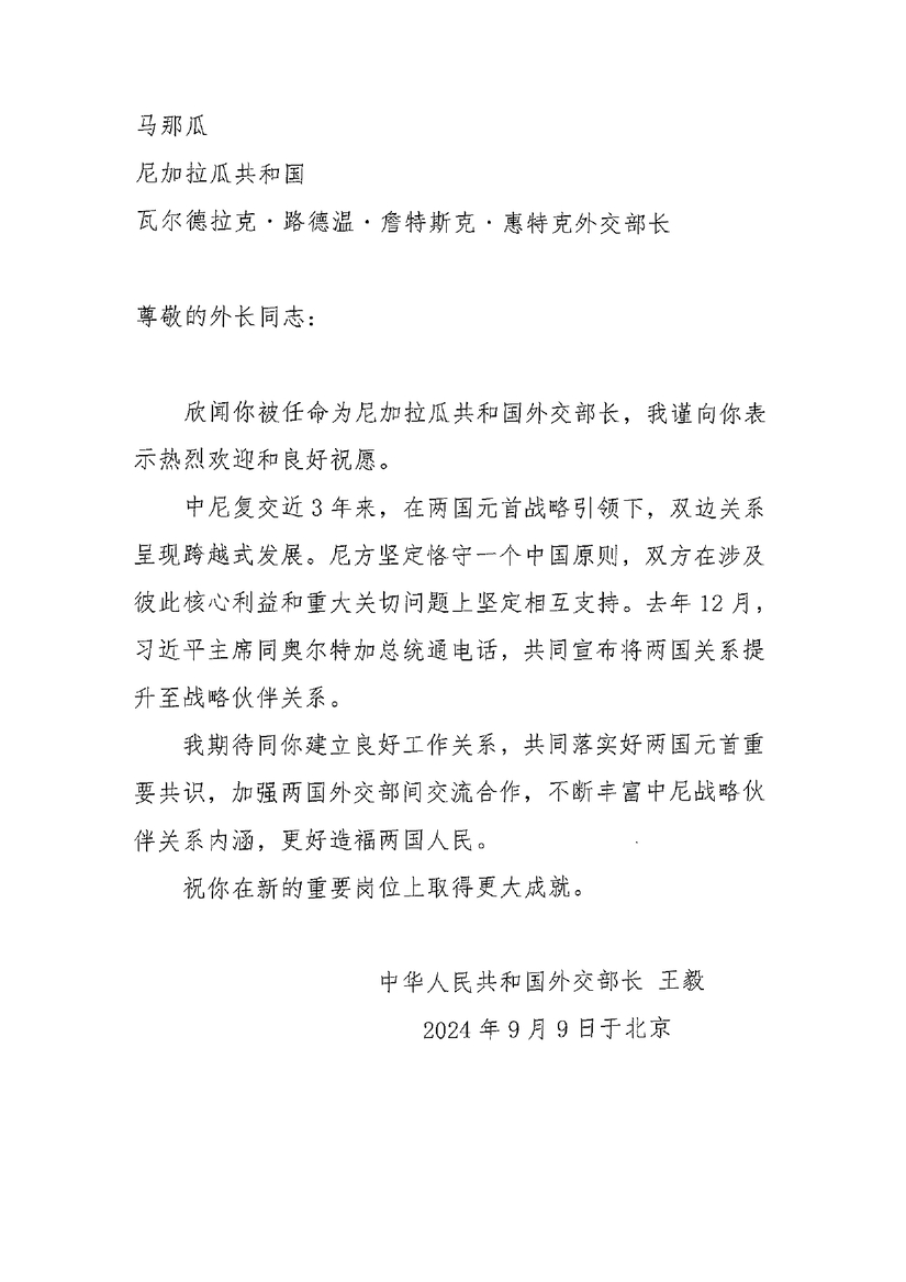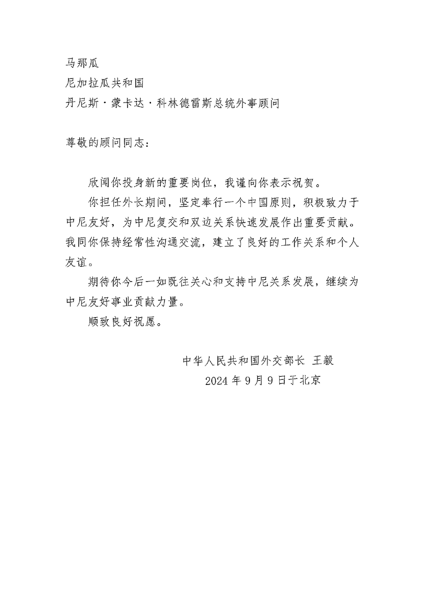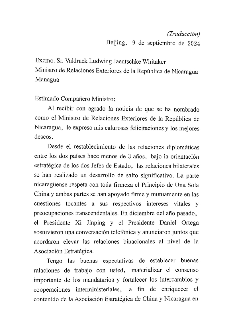 Mensaje del ministro de relaciones exteriores de la República Popular China al compañero Valdrack Jaentschke, Canciller de Nicaragua, y al Compañero Denis Moncada.