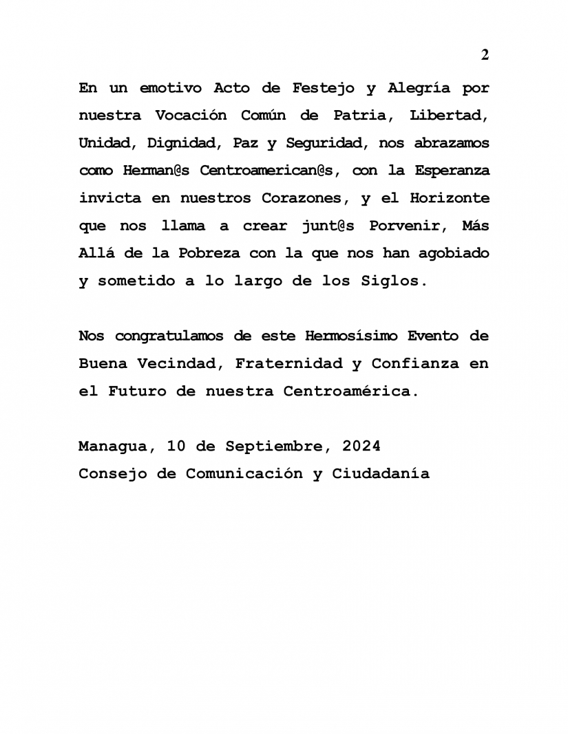In an emotional Act of Celebration and Joy for our Common Vocation of Nationhood, Freedom, Unity, Dignity, Peace and Security, we embrace each other as Central American Brothers and Sisters, with undefeated Hope in our Hearts, and that Horizon calling us to create a Future together, Beyond the Poverty with which we have been burdened and subjected over the Centuries.