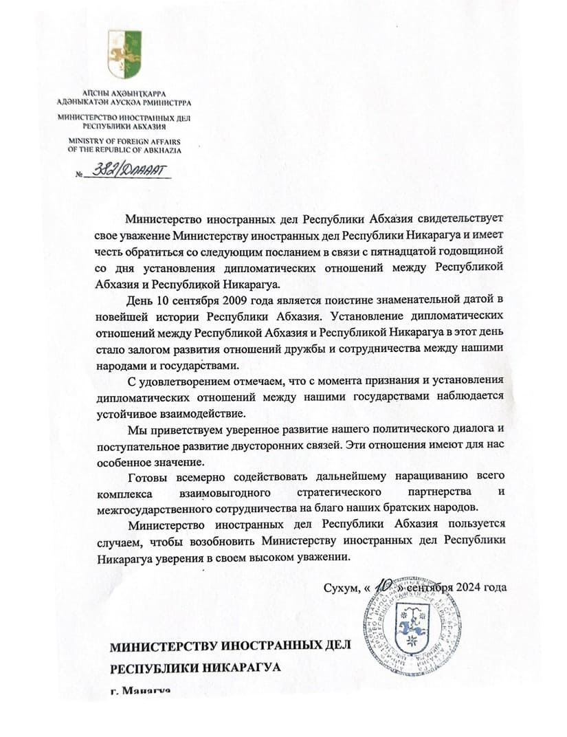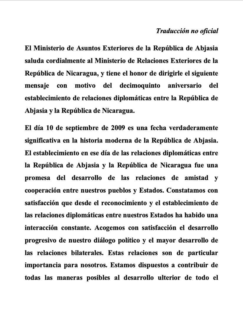 El Ministerio de Asuntos Exteriores de la República de Abjasia saluda cordialmente al Ministerio de Relaciones Exteriores de la República de Nicaragua, y tiene el honor de dirigirle el siguiente mensaje con motivo del decimoquinto aniversario del establecimiento de relaciones diplomáticas entre la República de Abjasia y la República de Nicaragua.