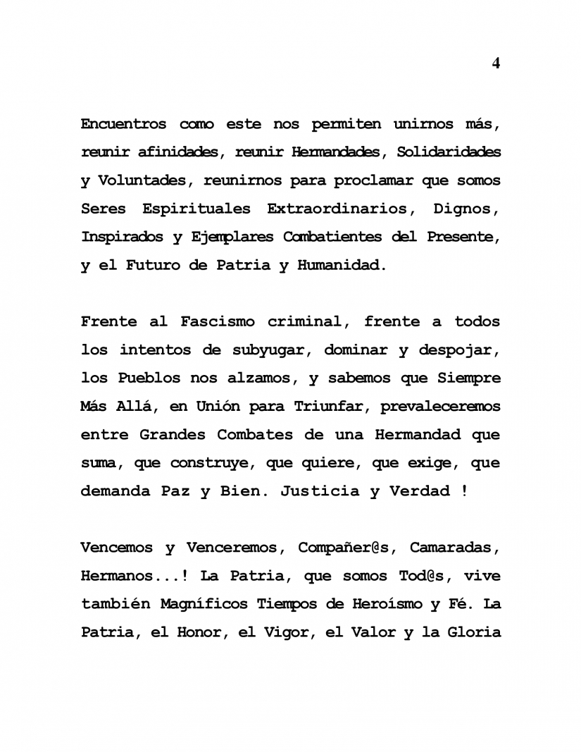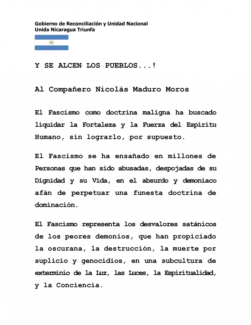 Confronting criminal Fascism, confronting all the attempts to subjugate, dominate and dispossess us, our Peoples rise up, knowing that Always Further On, United for Triumph, we will prevail through Great Battles of Brother and Sisterhood that includes, that builds, that wants, insists on and demands Peace and Goodness, Justice and Truth!
