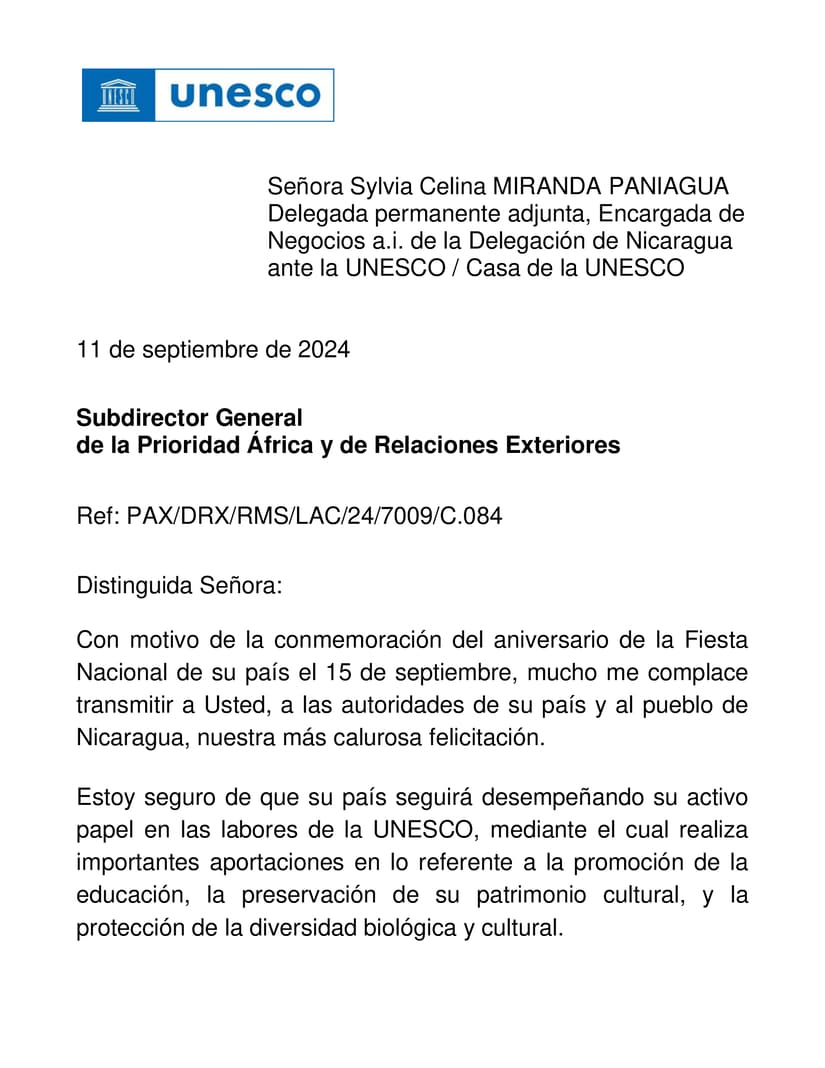 Mensaje de Felicitaciones del Señor Firmin Edouard Matoko, Subdirector General de la Prioridad África y de Relaciones Exteriores / UNESCO, a nuestro Pueblo y Gobierno, con motivo del Día de la Independencia de Nicaragua.