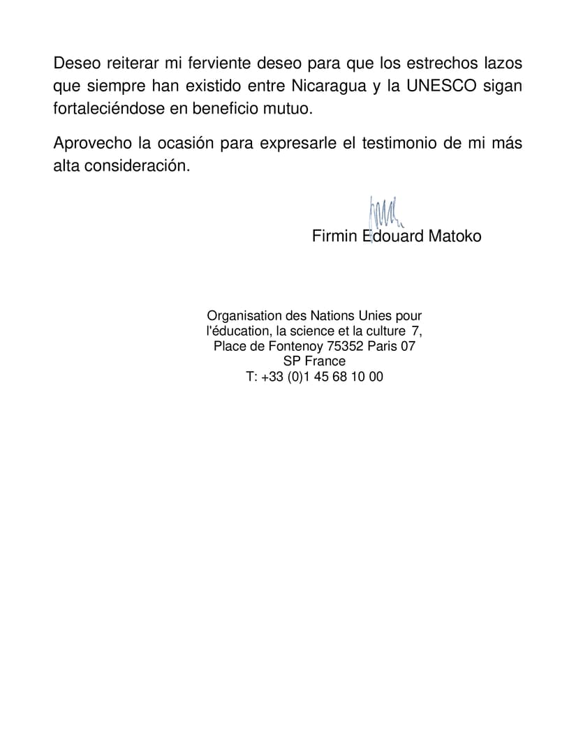 Deseo reiterar mi ferviente deseo para que los estrechos lazos que siempre han existido entre Nicaragua y la UNESCO sigan fortaleciéndose en beneficio mutuo.