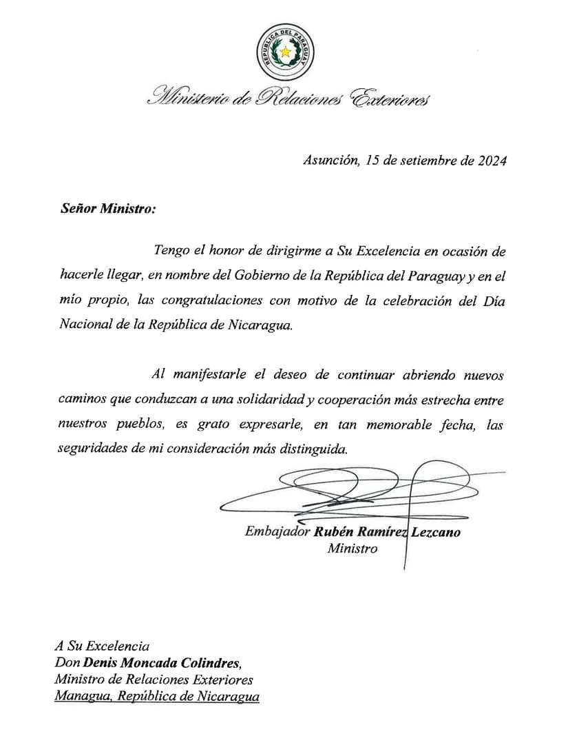Mensaje de Felicitaciones del Señor Rubén Ramírez Lezcano, Ministro de Relaciones Exteriores de la República de Paraguay, a nuestro Pueblo y Gobierno, con motivo del Día de la Independencia de Nicaragua.