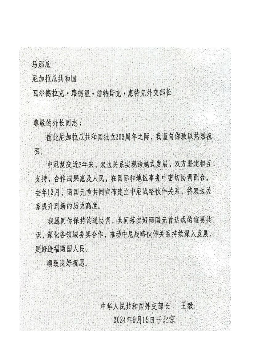 Mensaje de Felicitación del Compañero Wang Yi, Ministro de Relaciones Exteriores de la República Popular China, al Compañero Valdrack Jaentschke, Ministro de Relaciones Exteriores de Nicaragua, con motivo del 203 Aniversario de la Independencia de Nicaragua.