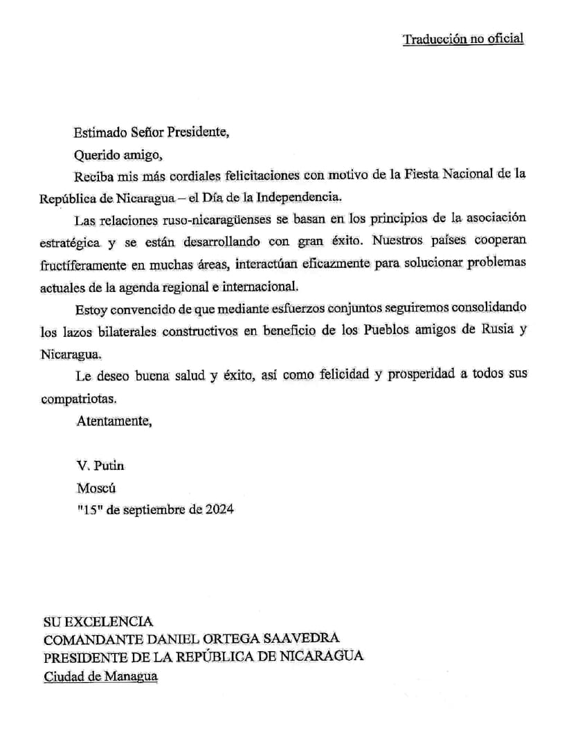 Mensaje de Felicitaciones del Compañero Vladímir Putin, Presidente de la Federación de Rusia, a nuestro Pueblo y Gobierno, con motivo del Día de la Independencia de Nicaragua.