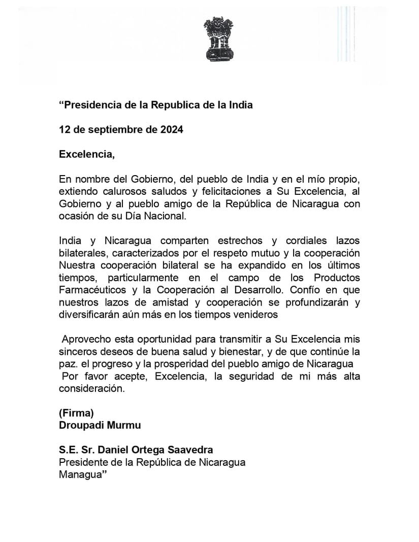 Mensaje de Felicitaciones de la Hermana Droupadi Murmu, Presidenta de la India, a nuestro Pueblo y Gobierno, con motivo del Día de la Independencia de Nicaragua.