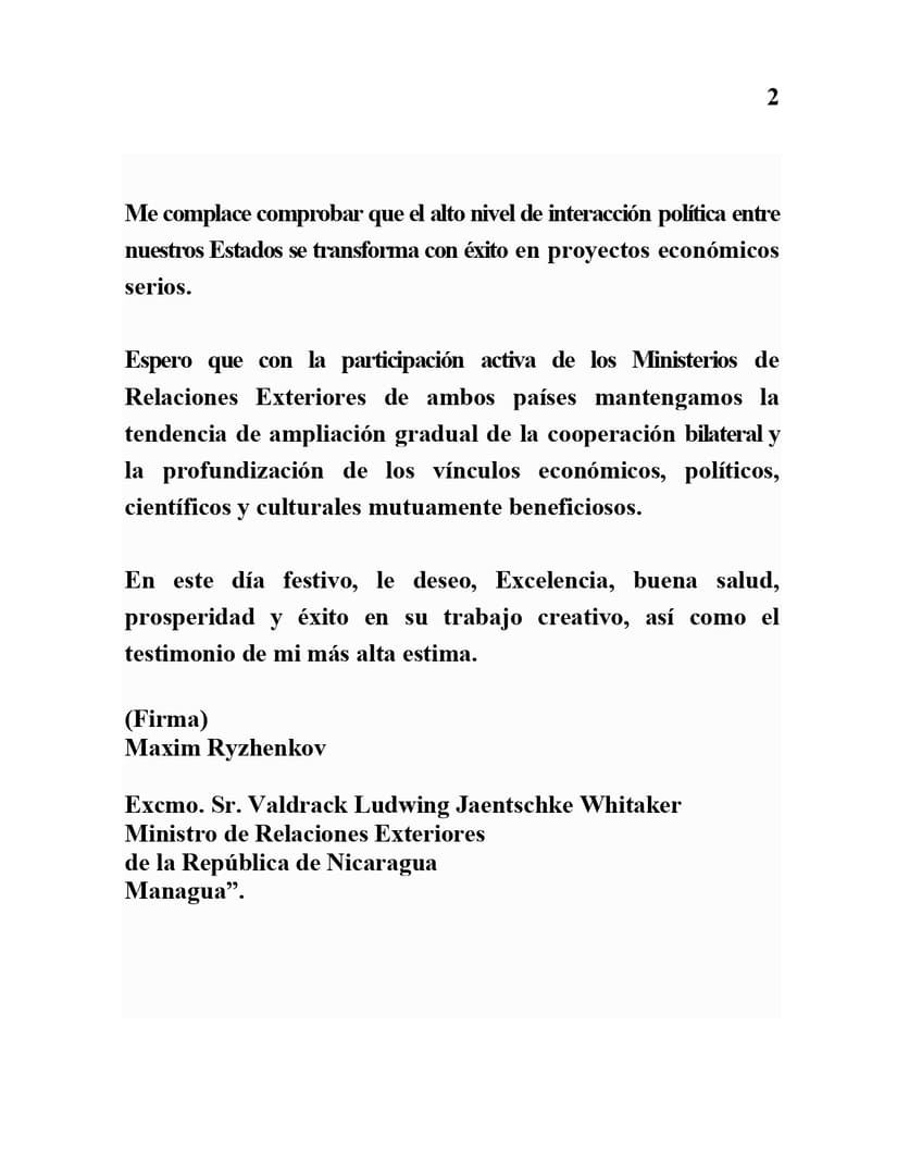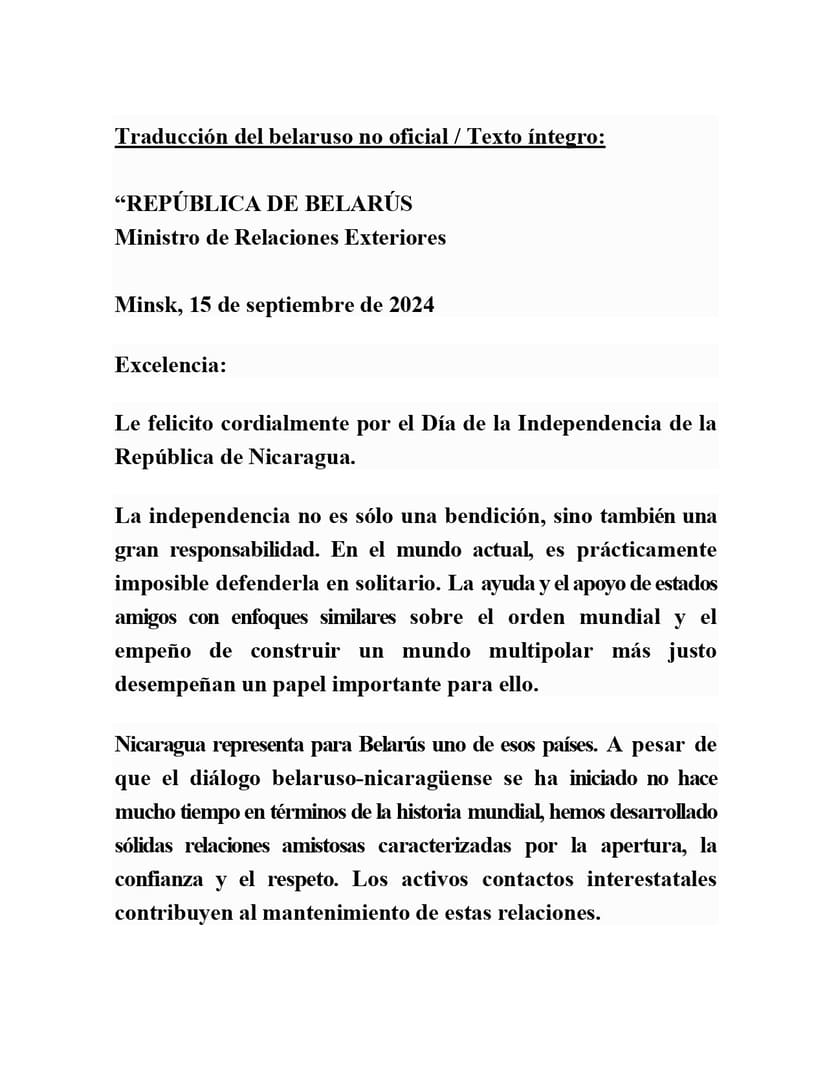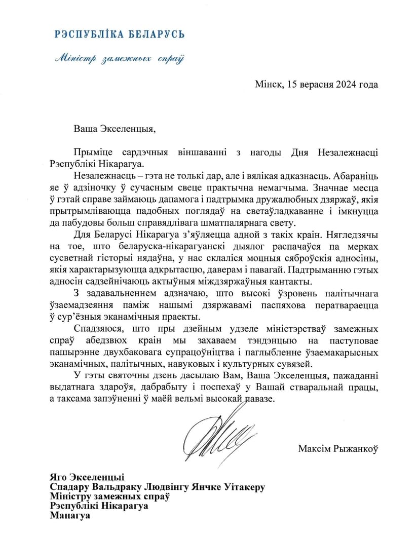 Mensaje de Felicitación del Canciller de Belarús, Compañero Maxim Ryzhenkov, al Compañero Canciller Valdrack Jaentschke, con motivo del Día de la Independencia de Nicaragua.