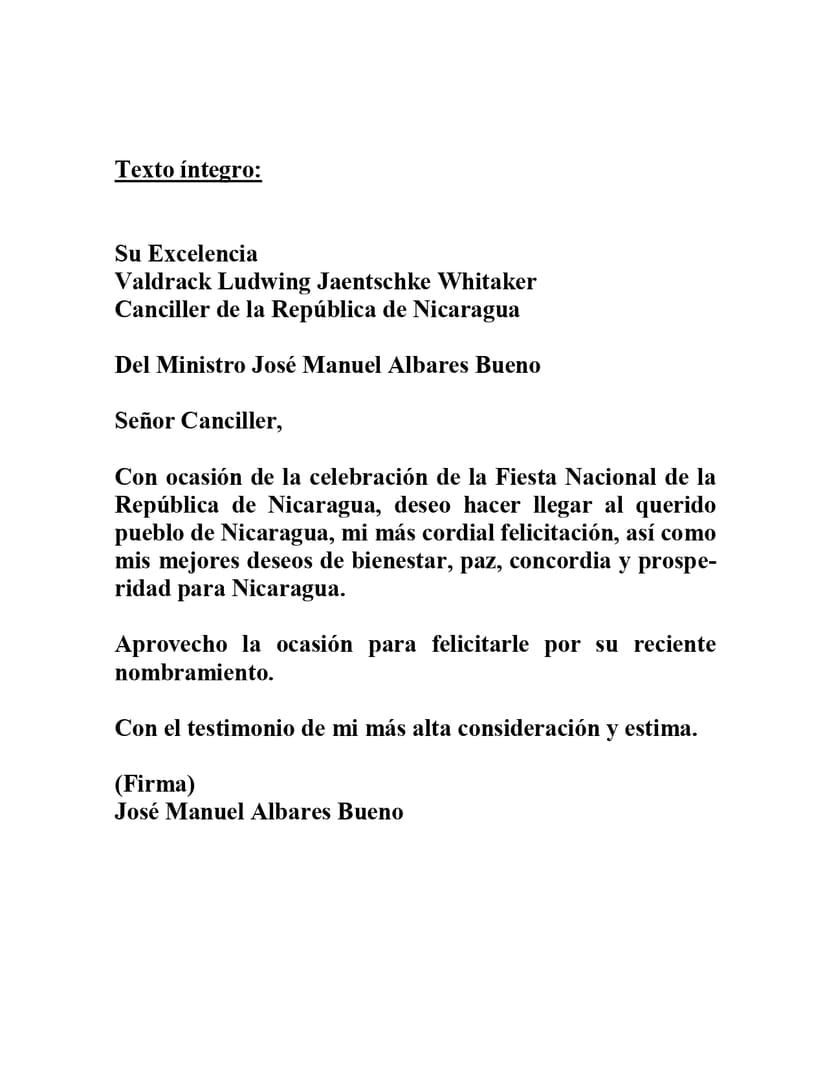 Mensaje de Felicitación del Ministro de Asuntos Exteriores, Unión Europea y Cooperación de España, Señor José Manuel Albares Bueno, al Compañero Valdrack Jaentschke, con motivo de la Independencia de Nicaragua y por su Nombramiento como Ministro de Relaciones Exteriores de nuestro País.