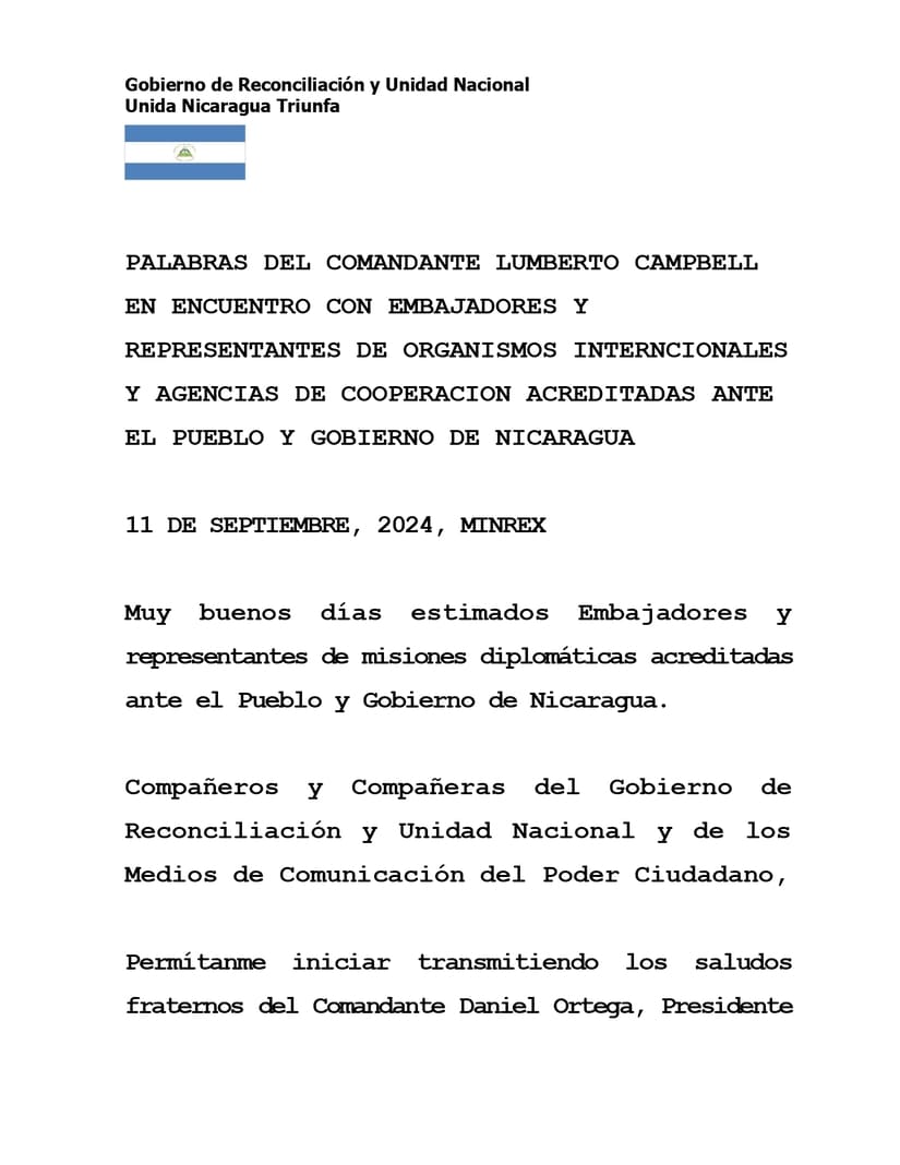 Muy buenos días estimados Embajadores y representantes de misiones diplomáticas acreditadas ante el Pueblo y Gobierno de Nicaragua.