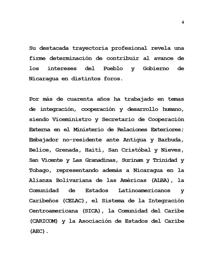 Su destacada trayectoria profesional revela una firme determinación de contribuir al avance de los intereses del Pueblo y Gobierno de Nicaragua en distintos foros.