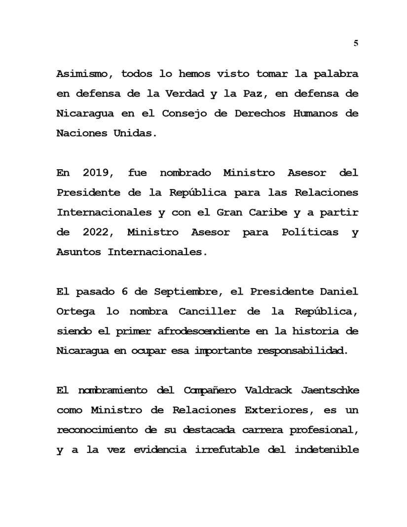 El nombramiento del Compañero Valdrack Jaentschke como Ministro de Relaciones Exteriores, es un reconocimiento de su destacada carrera profesional, y a la vez evidencia irrefutable del indetenible avance de nuestra Revolución que le cumple al Pueblo Nicaragüense.