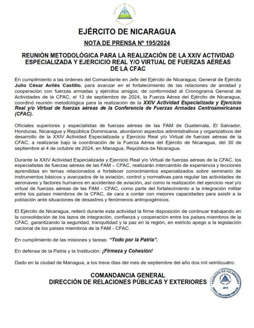 En cumplimiento a las órdenes del Comandante en Jefe del Ejército de Nicaragua; General de Ejército Julio César Avilés Castillo, para avanzar en el fortalecimiento de las relaciones de amistad y cooperación con fuerzas armadas y ejércitos amigos; de conformidad al Cronograma General de Actividades de la CFAC, el 13 de septiembre de 2024, la Fuerza Aérea del Ejército de Nicaragua, coordinó reunión metodológica para la realización de la XXIV Actividad Especializada y Ejercicio Real y/o Virtual de fuerzas aéreas de la Conferencia de Fuerzas Armadas Centroamericanas (CFAC).