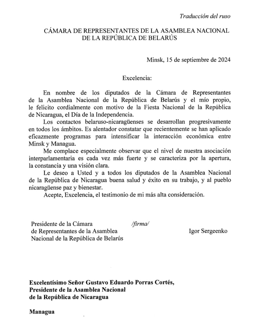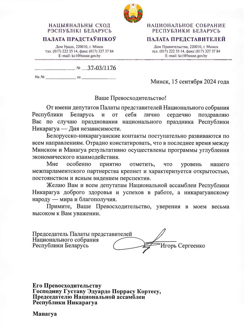 Mensaje de Felicitación del Compañero Igor Sergeenko, Presidente de la Cámara de Representantes de la Asamblea Nacional de la República de Belarús, al Doctor Gustavo Porras, con motivo de la Independencia de Nicaragua.
