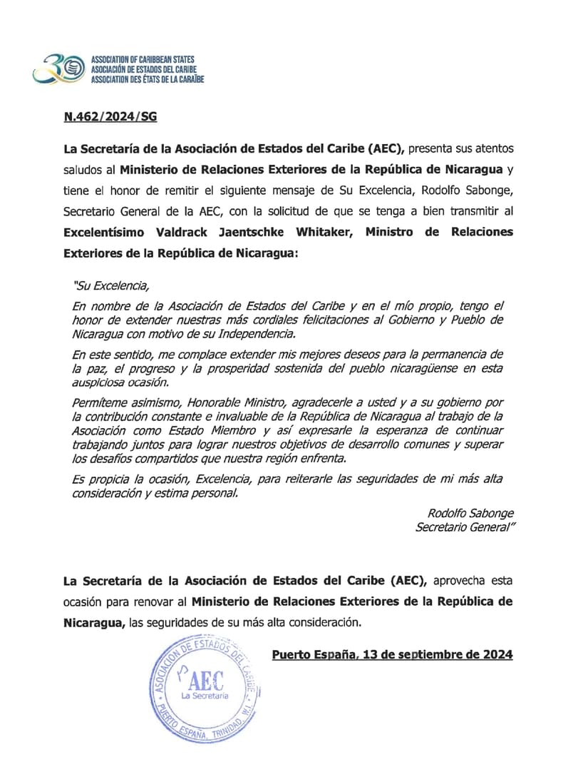 Mensaje de Felicitación del Secretario General de la Asociación de Estado del Caribe, Señor Rodolfo Sabonge, al Compañero Valdrack Jaentschke, con motivo de la Independencia de Nicaragua.